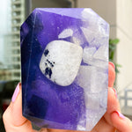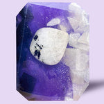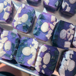 I literally gasped when pulling this bar out of the box. It's so beautiful. The little white glittery cubes on the side are so attention-grabbing, and the contrast with the white against the deep purple is so elegant. The scent coming through the plastic is intense and I can't wait to use it!